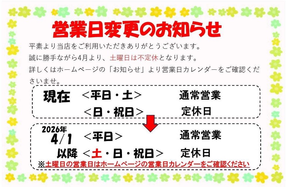 お知らせ 営業時間延長のご案内 2025.05.14 2025年6月2日(月)より、営業時間を変更させていただきます。◎変更前電話受付8:00~17:00店頭販売8:00~16:30◎変更後電話受付8:00~17:10店頭販売8:00~16:45今後とも変わらぬご愛顧の程、よろしくお願い申し上げます。